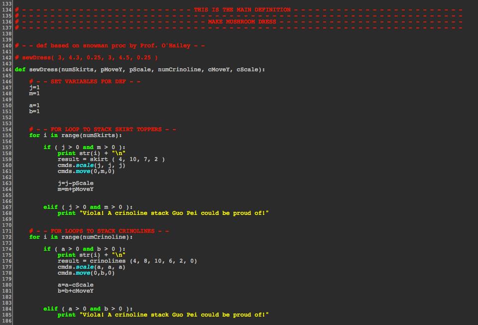 The sew dress is the main def of this script, and this is where the user should and does spend their time. The variables in this def control the number of skirts/crinoline sections in the stack, the position they stack in the Y axis, and the scale increment (scaling down as they move up). There are two for loops in this def, one that stacks the skirts and one that will stack the crinolines. The crinoline and skirt defs made above in the script are plugged into the for loops of this def; so if the user wanted to wear.